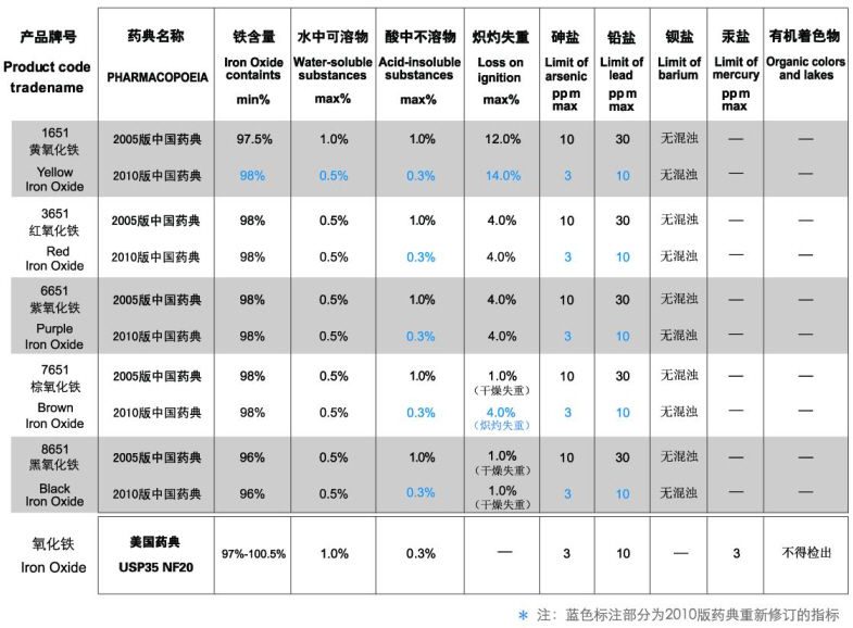 3黄氧化铁的铁含量、水中可溶物、炽灼失重及棕氧化铁的炽灼失重均与2005版药典有所不同。