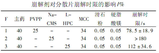 在相同用量条件下,不同崩解(PVPP, CMS-Na, L-HPC)剂对三七总皂苷分散片崩解时间的影响。
